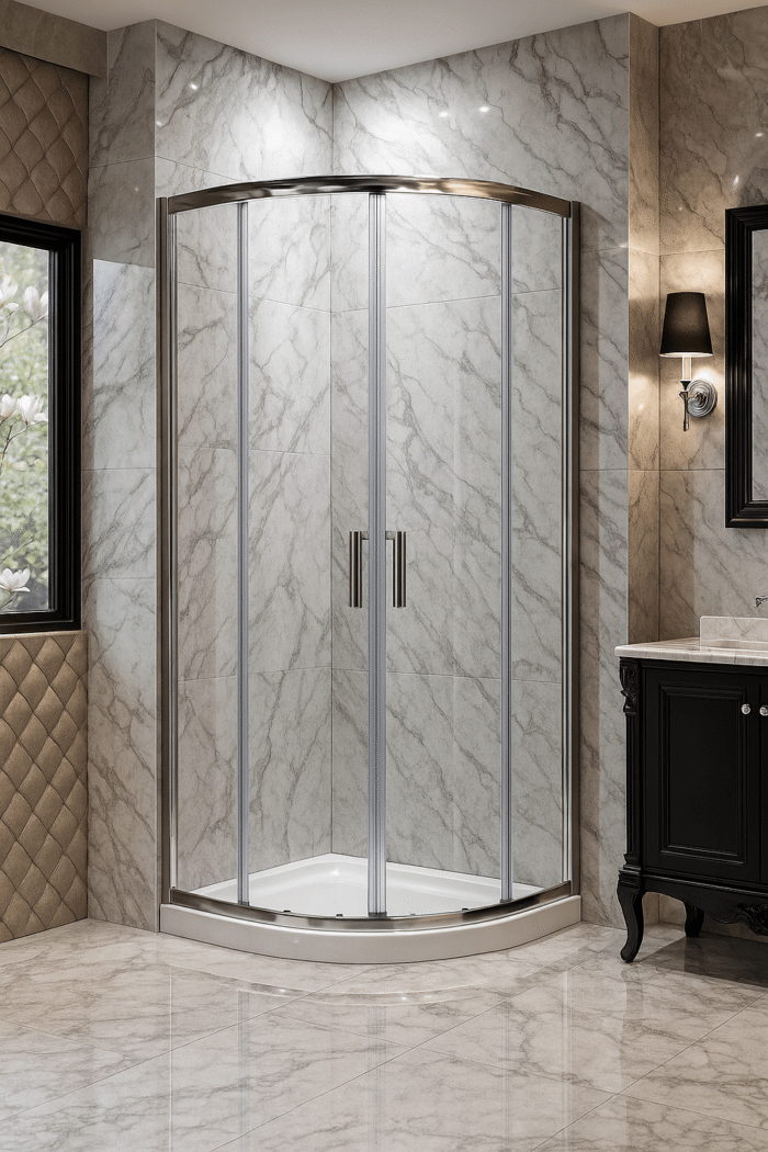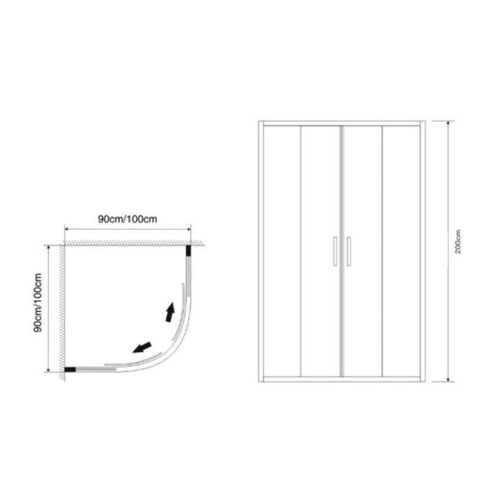 Pisa kwartrond douchecabine met 6mm helder glas, verkrijgbaar in chroom of zwart.